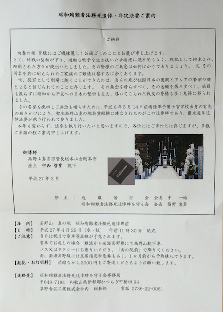 昭和殉難者法務死追悼法要の案内が来た