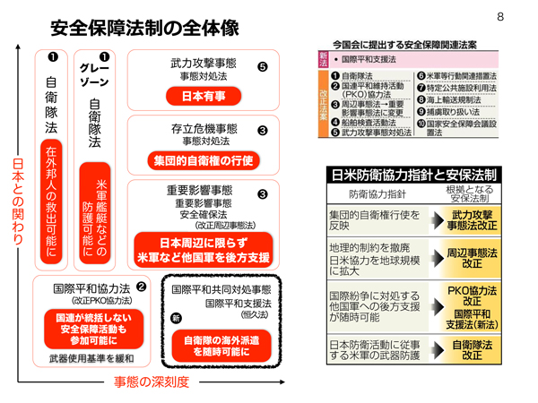 日米新ガイドラインは、いついかなる状況のもとでも、自衛隊がアメリカの兵站活動を担う約束をし、地理的な限定をなくし、地球の裏側でさえ行くことを具体化している。新聞でも安全保障法と日米ガイドラインの関係を図表にして解説しているが、まさに今回の安全保障法は、アメリカとの約束を果たし、日米軍事同盟を強化するところに最大の目的がある。
