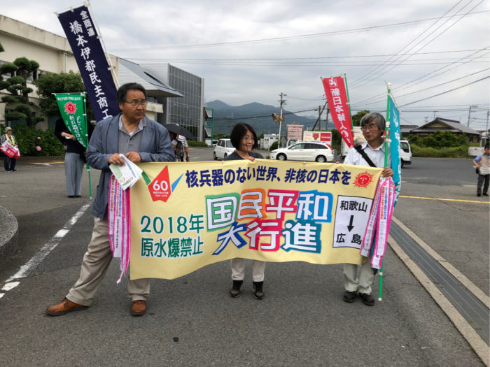 原水爆禁止の平和行進が午後5時から役場前で行われ、日本共産党町議団を代表して挨拶をさせていただいた。井本泰造町長が集会に出席してくれて、本人による挨拶もあった。平和行進は、毎年役場前を出発して大和街道を東に歩き、妙寺駅前の信号を渡って妙寺駅で終了となる。