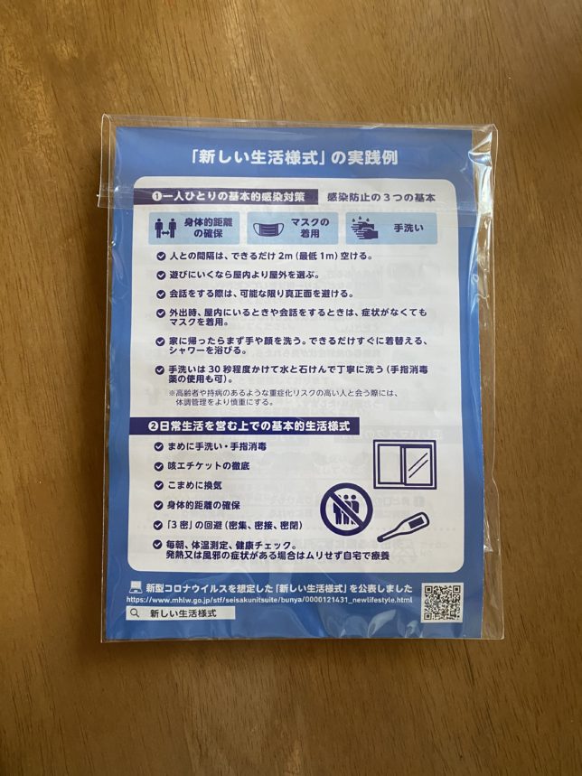 フィルムを裏返すと「新しい生活様式」の実践例が書かれていた。この話が打ち出されたのは、5月4日だから、それ以後印刷して透明なフィルムに入れて配布作業を行ったことになる。順次発送されると各戸には2日ないし3日で到着するだろうから、国民に発送する具体的な作業は、5月の半ば頃からだったのかも知れない。全国的な緊急事態宣言を解除したのが5月14日だったから、もしかしたら全国一律の緊急事態宣言解除後に配布作業が行われた可能性もある。遅くないだろうか。