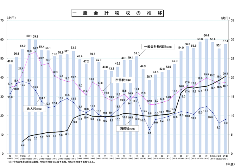 この30年間、消費税を3%から5%に、5%から8%に、8%から10%に引き上げ続け、その一方で法人税率を40.9%から37.5%に、さらに34.5%に、続いて25.59%に引き下げ続けてきた。平成2年、3.3兆円から始まった消費税収が日本の最大の税収になり、令和3年度予算では、20兆円を超えた。同じ時期の推移を見てみよう。所得税収は、21.4兆円から18.7兆円に下がり、法人税収は、19.0兆円から9.0兆円に下がってきた。