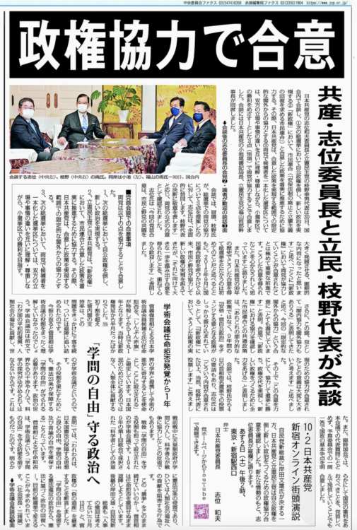 10月1日のこの赤旗の記事が、選挙終了後、日本の歴史の転換点になった日だという評価になるかどうかは、野党の今後のたたかいによる。衆議院選挙は、自公政権対野党連合による政権交代選挙となる。2009年9月16日の民主党政権の誕生から12年目の今年、野党は、6年間の政策を軸とした共同の中から共通政策を積み重ね、政権交代を見据えた政権協議で合意した。