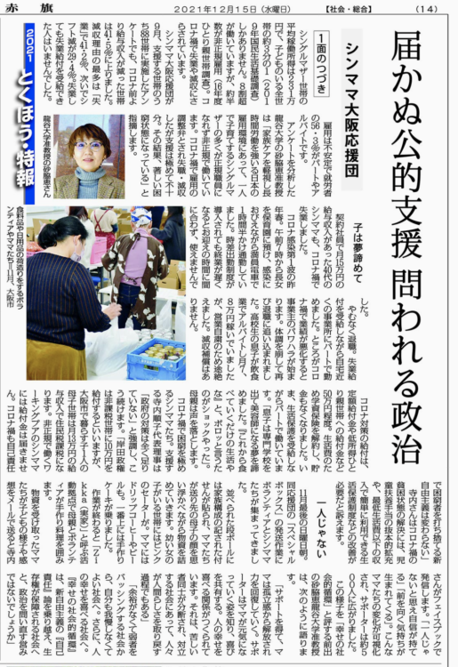 ラジオ深夜便による「明日への言葉」のコーナーでの寺内順子さんへのインタビューについて書いたら、15日の「赤旗」日刊紙にシンママ大阪応援団についての「特報」記事が掲載された。思わず町職員の人にも「読んでみて」と言ってしまった。このサポートの姿勢、関わり方を胸に刻んで活動したいと思っている。ぼくは、SOSメールが届いていたのに、それに気づかず信頼を失ってしまったこともあった。それでも、支援の仕方としてはこうありたいと思って、いつもシンママ大阪応援団の活動に注目し、シンママさんたちが書いたメッセージを寺内順子さんのフェイスブックを通じて読ませていただいている。