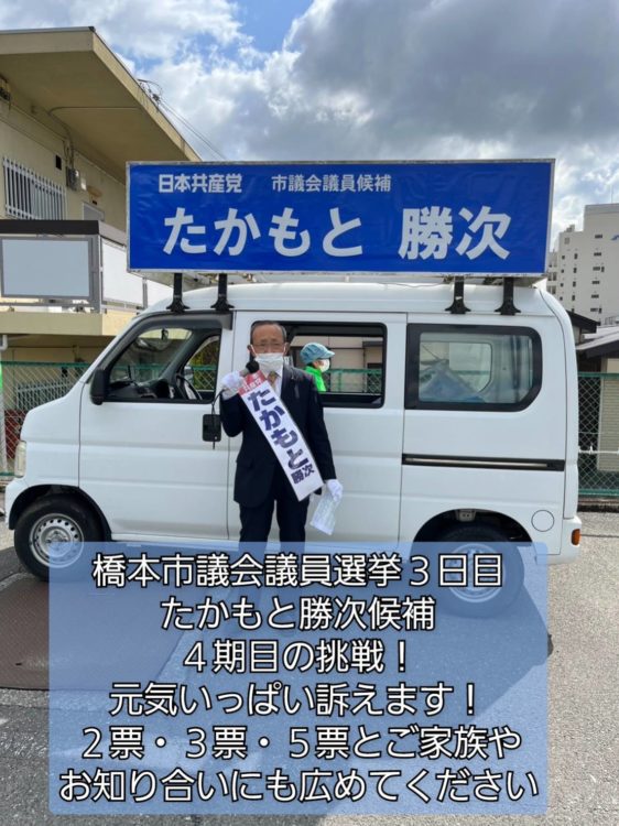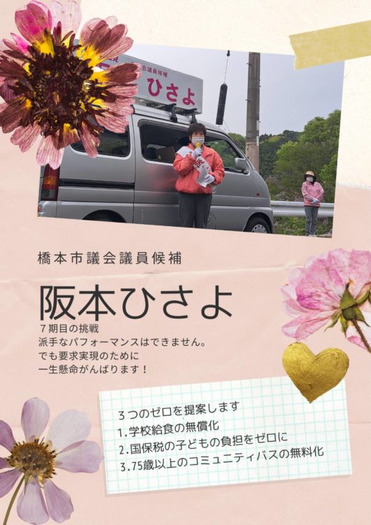 阪本ひさよとたかもと勝次の2つの議席は、市民の願いを実現する上でなくてはならない議席です。日本共産党の議員と市民が一緒に運動すれば、市政も議会の動きも変わり、市民の願いは実現します。努力を重ねれば政治は変わります。市議選で争われているのは、すべて、くらしや福祉、生活に関わるものばかりです。あなたの1票は、政治を変える大きな力を秘めています。住みよい橋本市をつくるために、ぜひ、阪本ひさよとたかもと勝次さんを議会に押し上げて下さい。