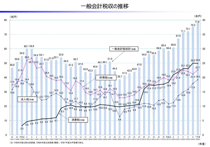法人税が、昭和62年から令和7年まで下がり、回復しつつあるように見えているのは、43.3%だった税率を23.2%に下げてきたからだ。大企業の利益が史上最大を更新しているのに税収は増えていない。ここに最大の特徴がある。