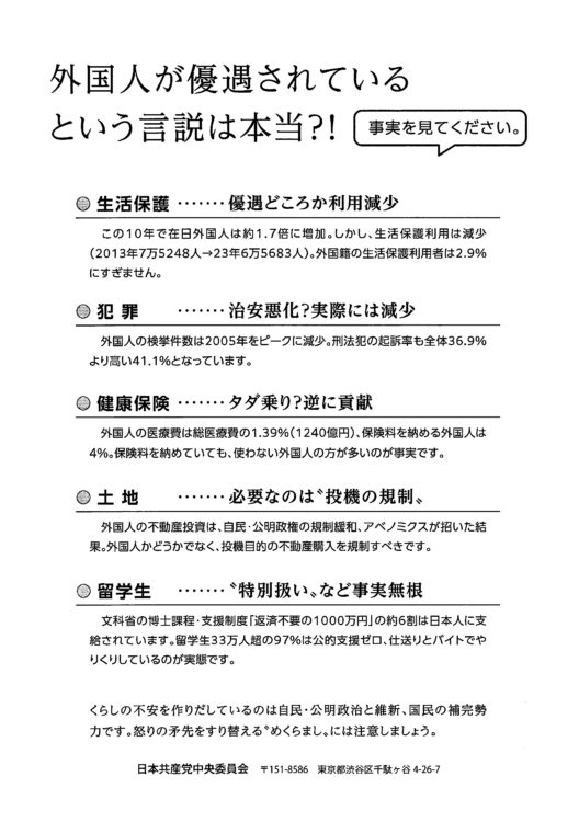 国民の中に持って行き所のない(本当は苦しみを生み出している根源は、大企業中心、アメリカの利益最優先してきた自民党的な政治になるのに、つまり与党の政治にあるのに)、不安や不満、怒りの感情をかすめ取って、暮らしが苦しいのは外国人の特権的な扱いにあるというウソで、怒りを組織している。これは怒りの矛先をねじ曲げるという役割を果たしている。