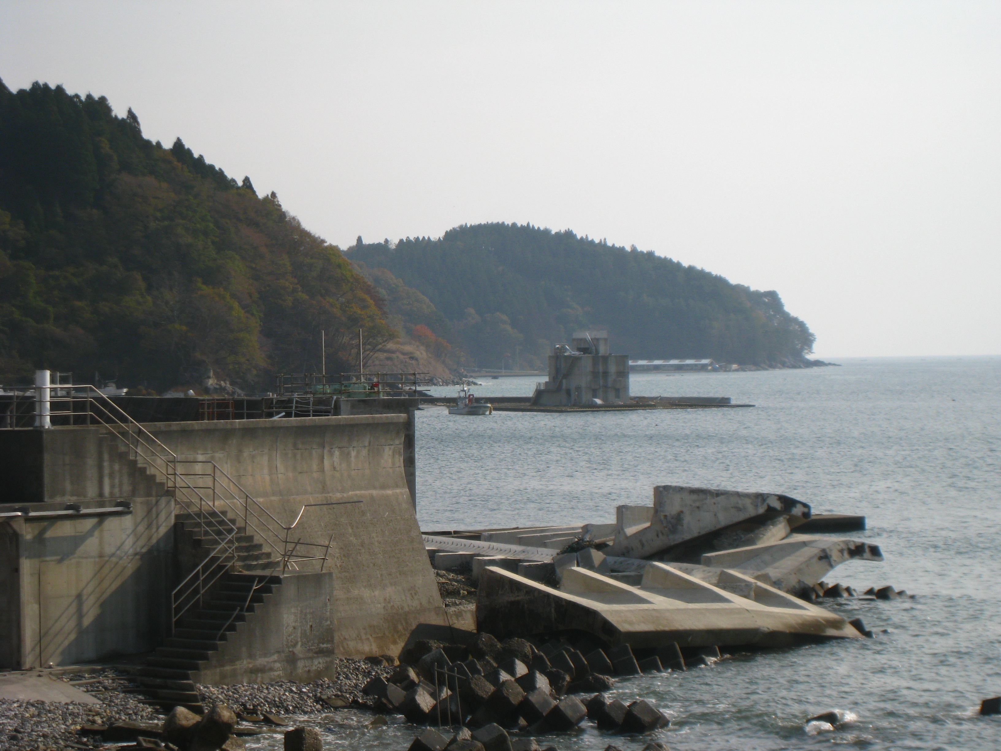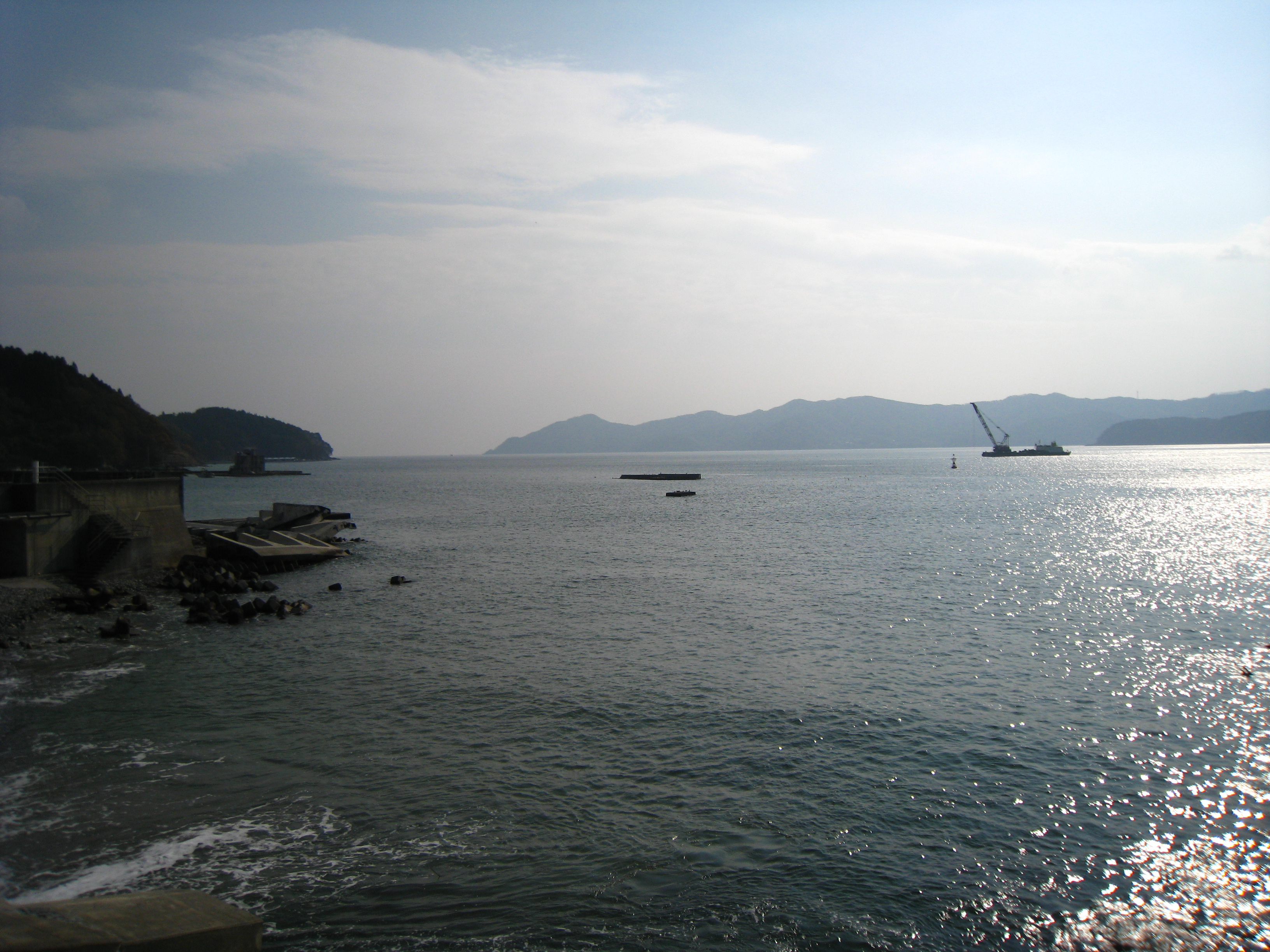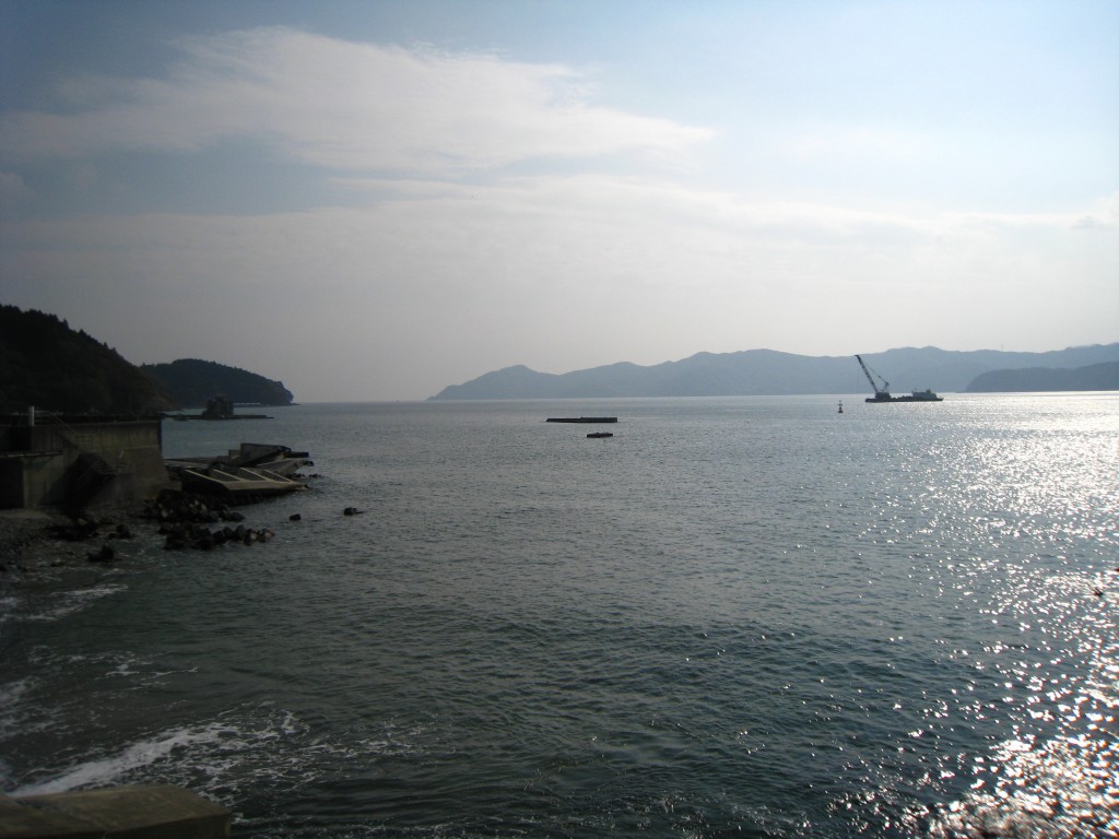 下の写真の真ん中ほど(湾の中ほど)に見えるのが残った防波堤だ。以前は湾を囲むように右側と左側から伸びていた。残されたのはほんの少しだけだった。