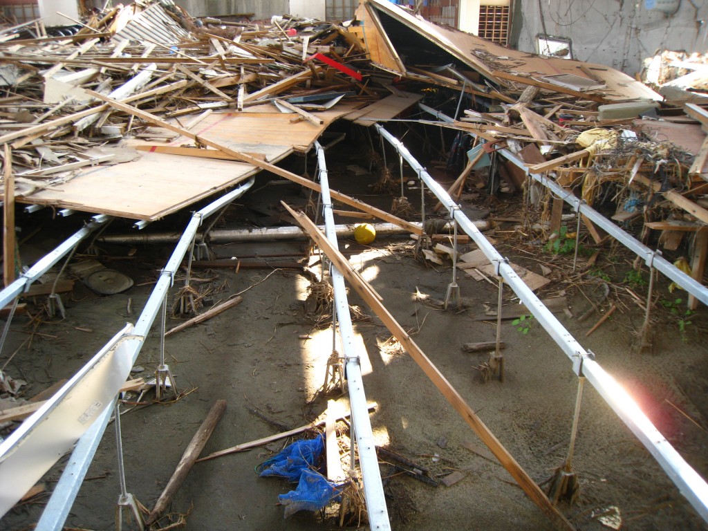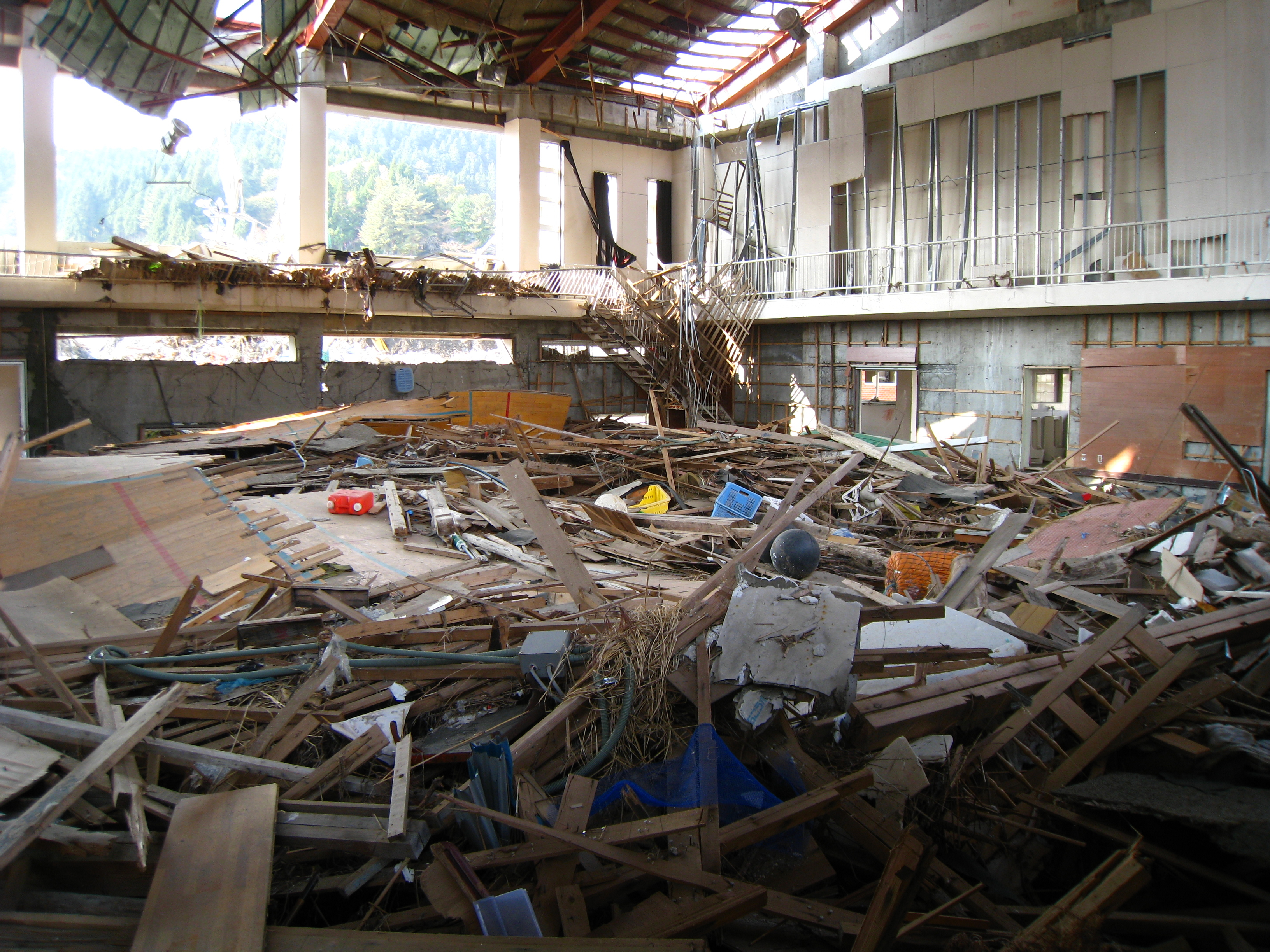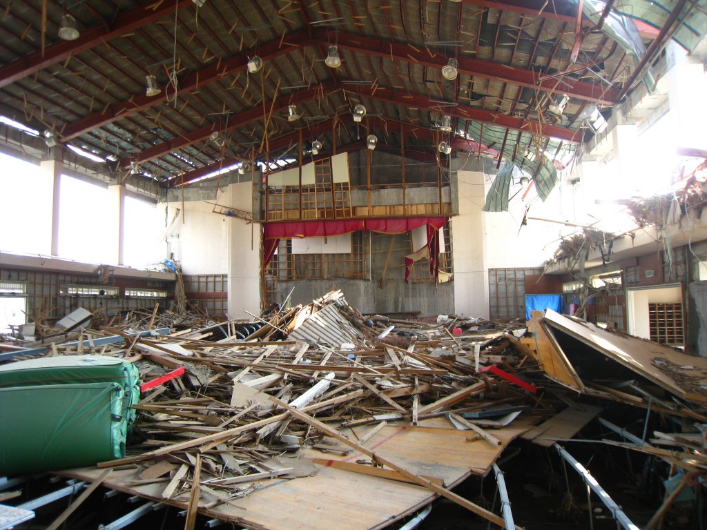 越喜来小学校は、屋根を超える津波に襲われた。津波は12回、13回というように何度も押し寄せては引き、押し寄せたという。そのたびに家や建物が壊され、瓦礫が建物の中に入り、引き潮によって窓やドアから瓦礫が出るという現象に見舞われた。また大量に押し寄せた海水は、さまざまな渦をつくりいろいろなものを破壊した。学校の中を見せてもらったが、まだ手つかずの状態だったので津波がどのようなものだったかを感じることができた。下の写真は体育館の中の状態だ。人間の生活のあらゆるものが、瓦礫となって流れ込んできたのがよく分かる。