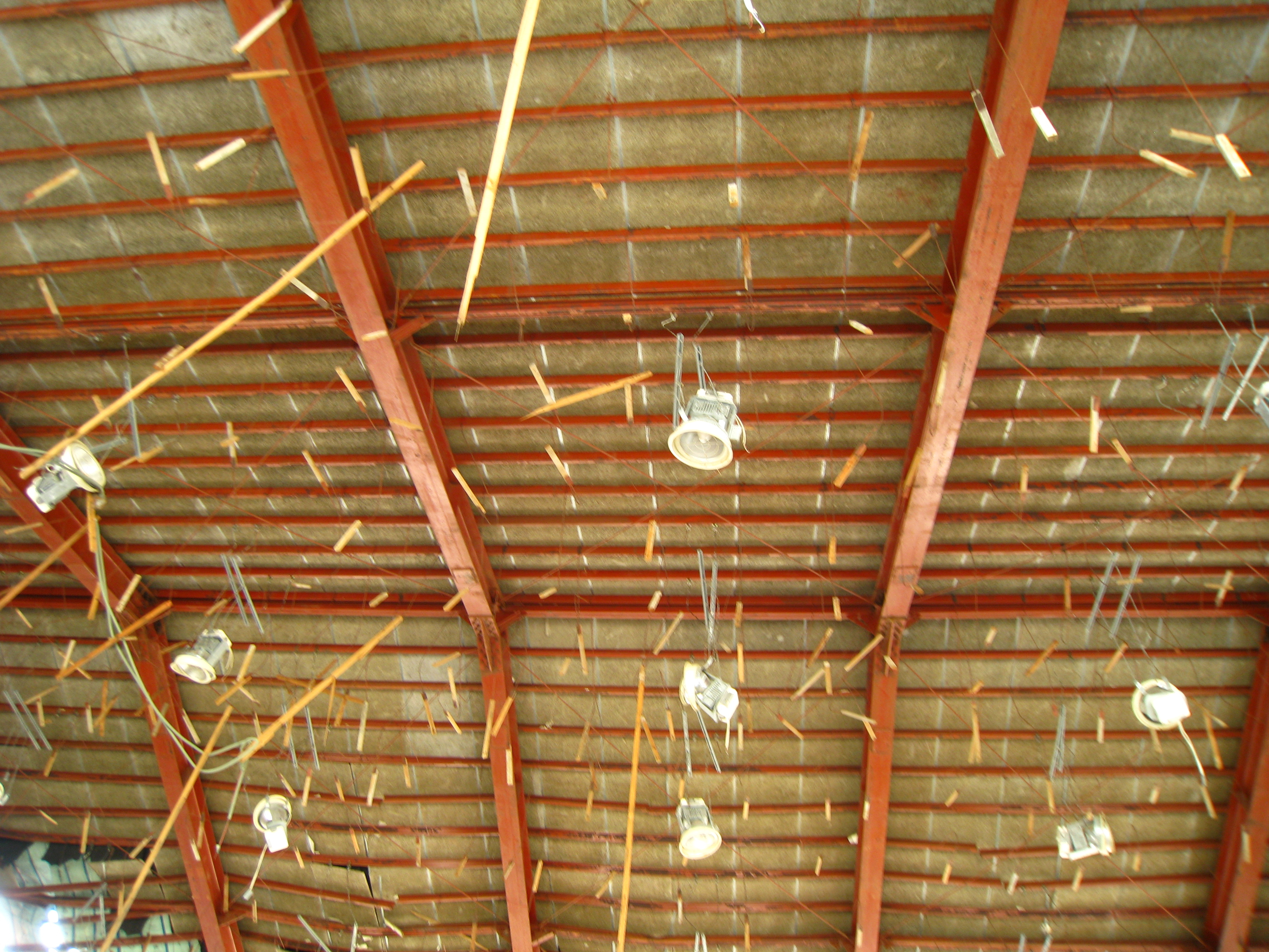 天井まで水がついたことによって、天井を支えていた木材が破壊されて上からぶら下がっている。