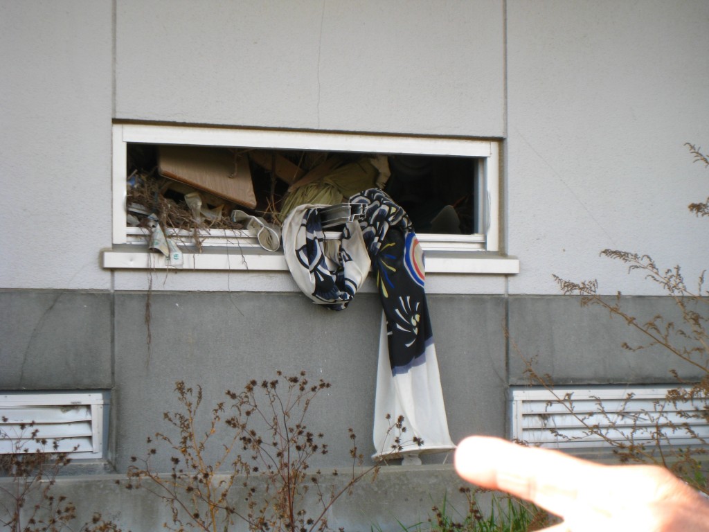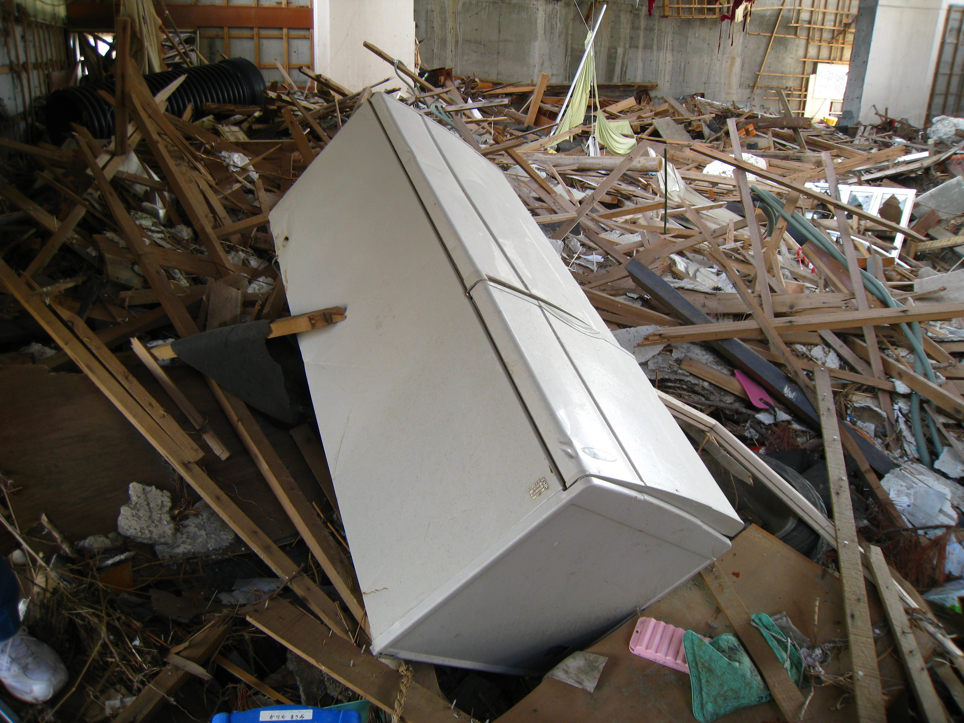 引き潮によって窓から流れ出ようとしている瓦礫。どこから来たのか鯉のぼりがある。