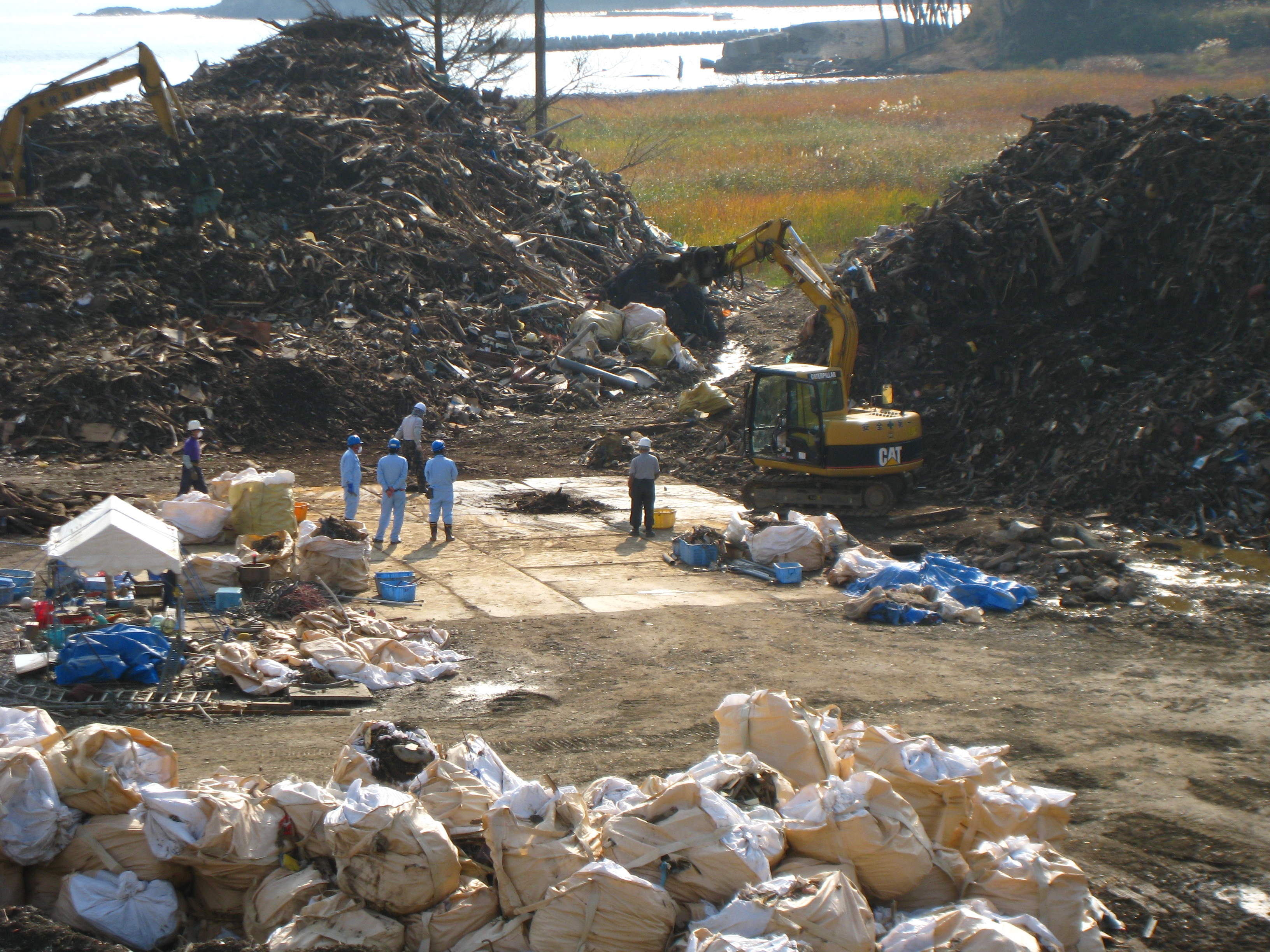 14日は、田中さんの案内で大船渡と陸前高田の被災状況を視察させてもらった。震災から8か月が経過した今、瓦礫の撤去が大きく進み、住宅地でも更地が目立つようになっている。住宅の撤去は公共工事として住民の負担なしに行われるようになっていて、住宅の基礎の解体もかなりの規模で進んでいる。大船渡や陸前高田では、工事を受注した土木事業所が、臨時の作業員を雇用して解体と分別作業をあちこちで行っていた。入り交じっている瓦礫を分別するのは骨が折れる作業だが、この分野では、ボランティアの仕事という域を超えて災害復旧工事の一環として事業が動き始めているのを感じた。下の写真は、越喜来(おきらい)小学校のグラウンドで行われている分別作業だ。